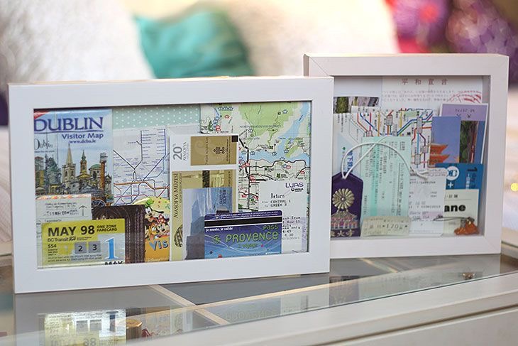 Ingressos de museus, mapas da cidade, cartões de hotel, folhetos e todo tipo de impresso que você pode conseguir tanto de graça, quanto em visitas a lugares turísticos pagos, tudo isso pode ser guardado, e quando reunido pode ser emoldurado e exposto como ótimas lembranças daquele lugar que você foi e foi tão especial.